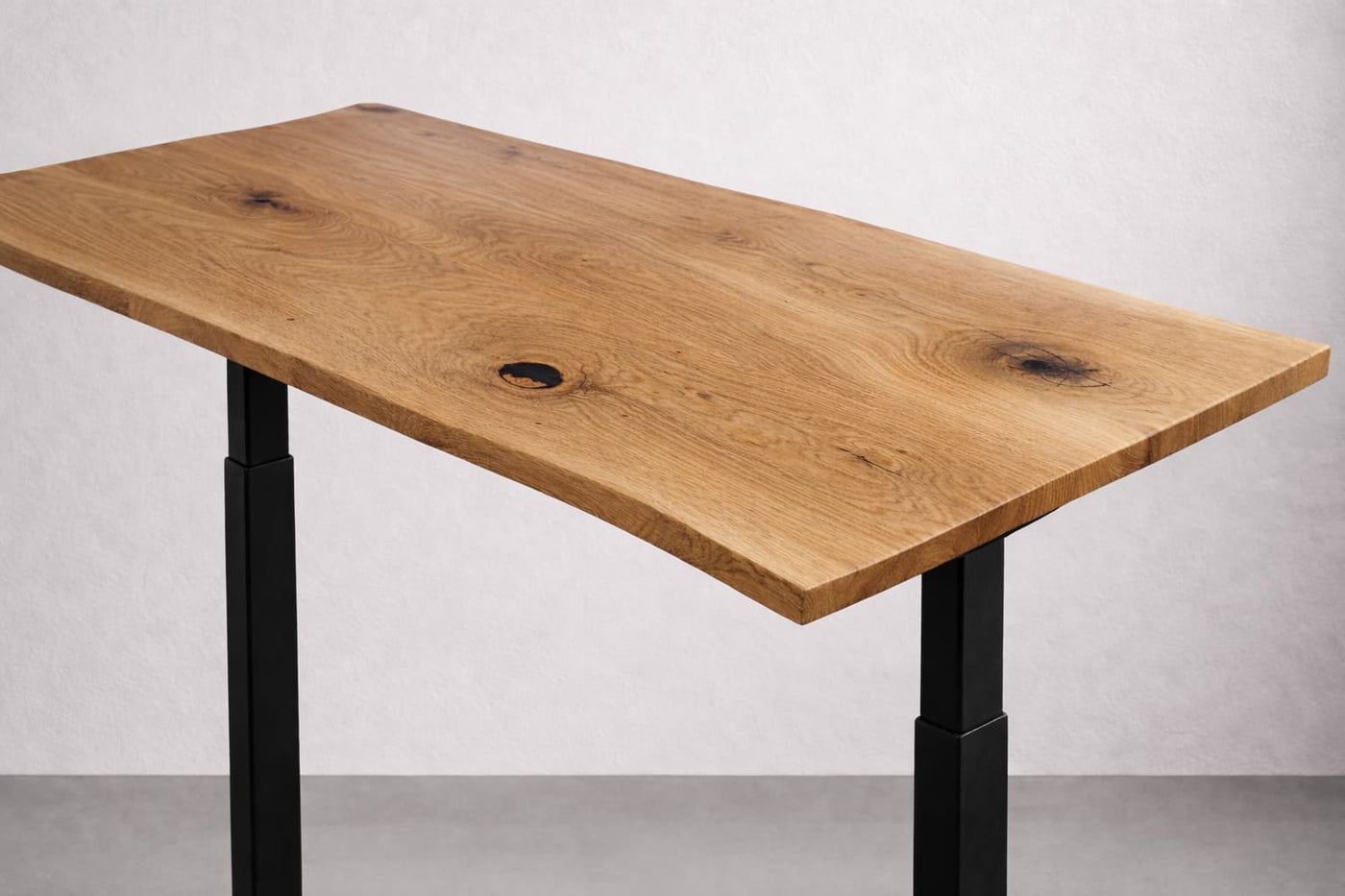 ALIVE Oak Desks — 4cm full-thickness plank with a natural live (tree-shape) edge. Sealed under protective varnish. Heavier, more characterful, a chunkier, statement piece.