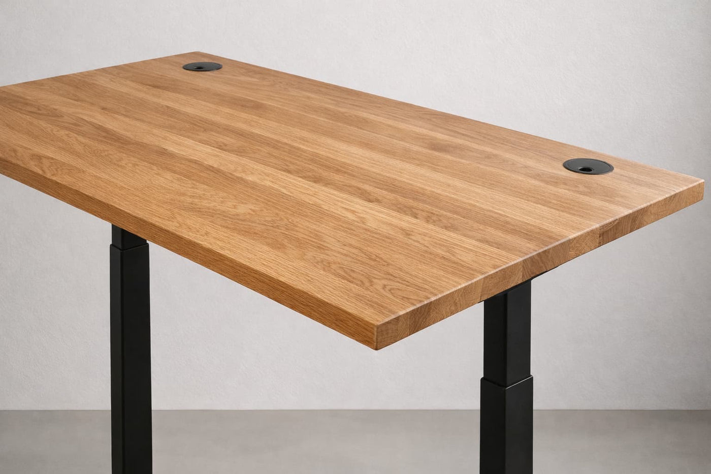 SOLID Oak Desks — 2 cm thick with under-edge → creates a look of 4cm thick desktop. Hand-finished in linseed oil hard-wax. Lighter, cleaner lines, made from oak planks and with straight edges.