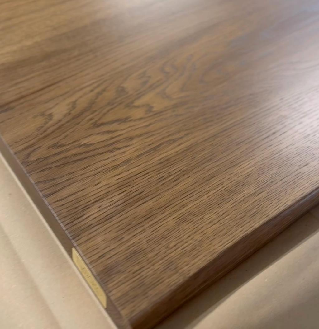 Terra Standing Desk er skåret ud af 100 % massiv eg og færdigbehandlet i en rig, dyb brun tone, der taler om jordnær elegance. Den levende kant følger træets naturlige linjer - der er ikke to skriveborde, der er ens.